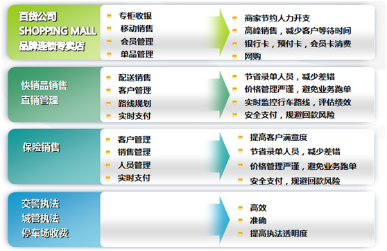移動(dòng)POS可以布局于百貨購(gòu)物中心和SHOPPING MALL 專(zhuān)柜,在專(zhuān)柜完成銷(xiāo)售和收銀,這樣可以有效的減少高峰銷(xiāo)售的壓力,提高銷(xiāo)售額,可以有效減少集中收銀的數(shù)量,從而大幅降低運(yùn)營(yíng)成本。專(zhuān)柜單品管理有利于線上線下業(yè)務(wù)的打通,從而開(kāi)拓網(wǎng)購(gòu)業(yè)務(wù)的新局面。